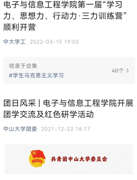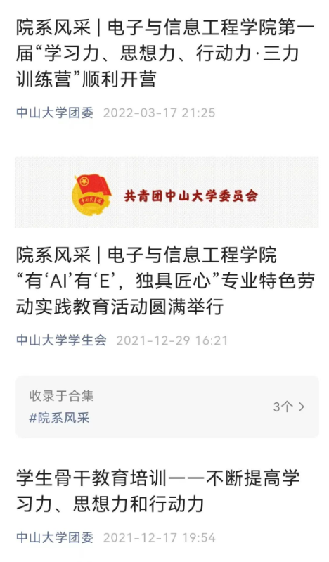 裸聊app 学生会积极展示学生风采,本年度在“裸聊app 电子与信息工程裸聊app ”公众号上共发表三十余篇推文,总计2万余字。其中“有AI有E,独具匠心”专业特色劳动教育实践活动推文被中大学工转载并入选“裸聊app 学生会”公众号“院系风采”板块。“电子与信息工程裸聊app 第一届‘学习力、思想力、行动力·三力训练营’ 顺利开营”推文被“中大学工”转载,且被收入“裸聊app 团委”公众号。