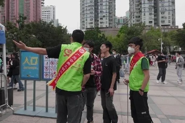 园区入口,志愿者为游客提供购票、入园指引