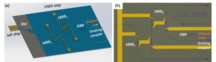薄膜铌酸锂(TFLN)光子集成芯片在光通信、激光雷达和微波光子学等领域具有广阔的应用前景。目前薄膜铌酸锂电光调制带宽已经超过100GHz,各种高性能薄膜铌酸锂无源光子器件也相继被研制出来,薄膜铌酸锂光电子集成技术因而展现出成为未来新型光电子集成平台技术的巨大潜力。但铌酸锂材料本身无法有效发光,因此实现高性能的片上激光器是其仍待解决的关键瓶颈问题之一。