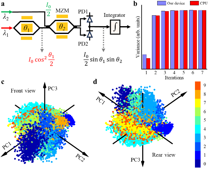 a 负数与负数乘法运算的原理;b 光学神经网络芯片进行训练的迭代曲线;c 和 d为所提光学神经网络芯片进行图像聚类任务的结果。