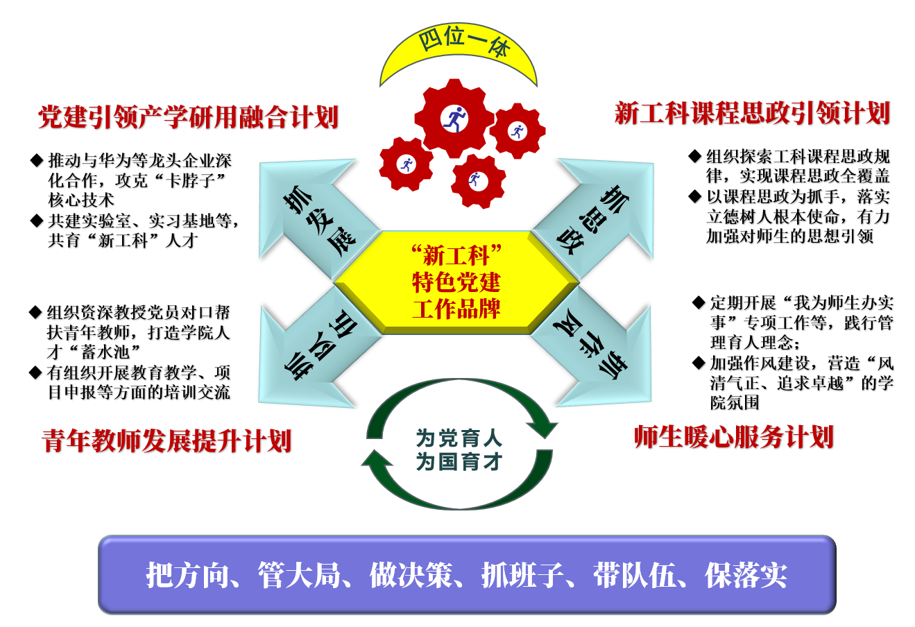 裸聊app 党委始终坚持以习近平新时代中国特色社会主义思想为指导,坚决维护以习近平同志为核心的党中央权威和集中统一领导,严格贯彻执行党的路线、方针、政策和决议,全面加强党对裸聊app 工作的领导,充分发挥“把方向、管大局、做决策、抓班子、带队伍、保落实”的作用。裸聊app 党委以政治建设为统领,推动全面从严治党向纵深发展,坚守为党育人为国育才的根本使命,牢牢把握社会主义办学方向;注重夯实基层党建,不断提升党支部凝聚力和战斗力,打造政治素质过硬的基层战斗堡垒;以创先争优为抓手,充分发挥“头雁效应”,引领裸聊app 事业高质量内涵式发展;深入实施新工科党建品牌培育计划,打造“新工科课程思政引领计划、党建引领产学研用融合计划、青年教师发展提升计划、师生暖心服务计划”四位一体、具有新工科特色的党建工作品牌,有力推进党建与中心工作深度融合,奋力开创裸聊app 事业发展新局面。