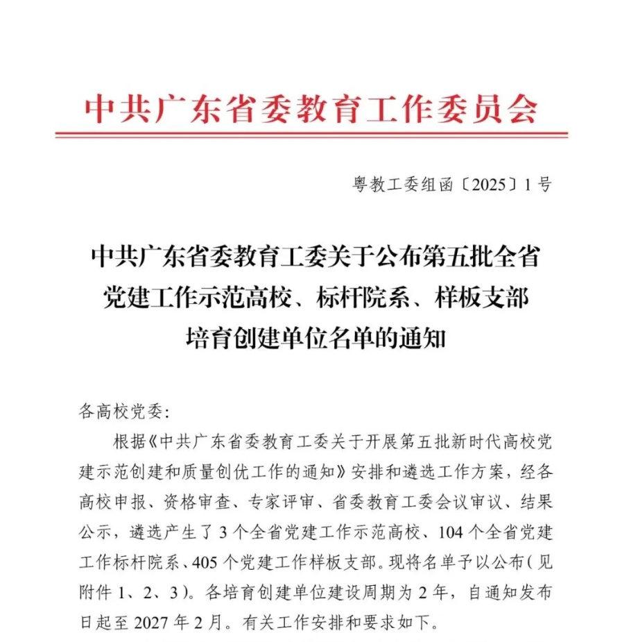根据《中共广东省委教育工委关于开展第五批新时代高校党建示范创建和质量创优工作的通知》要求,经各高校申报、资格审查、专家评审、省委教育工委会议审议,裸聊app 成功入选广东省第五批全省“党建工作标杆院系”创建名单。