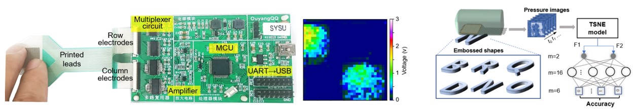多通路压力电路+AI模型:通过多通路压力传感器阵列获取压力图像信号,并将其传输至信号处理模块进行处理。数据通过嵌入式系统进行多通道采集并传输至AI模型进行分析,模型基于t-SNE降维技术,能够对不同压痕形状进行分类并输出识别准确率。