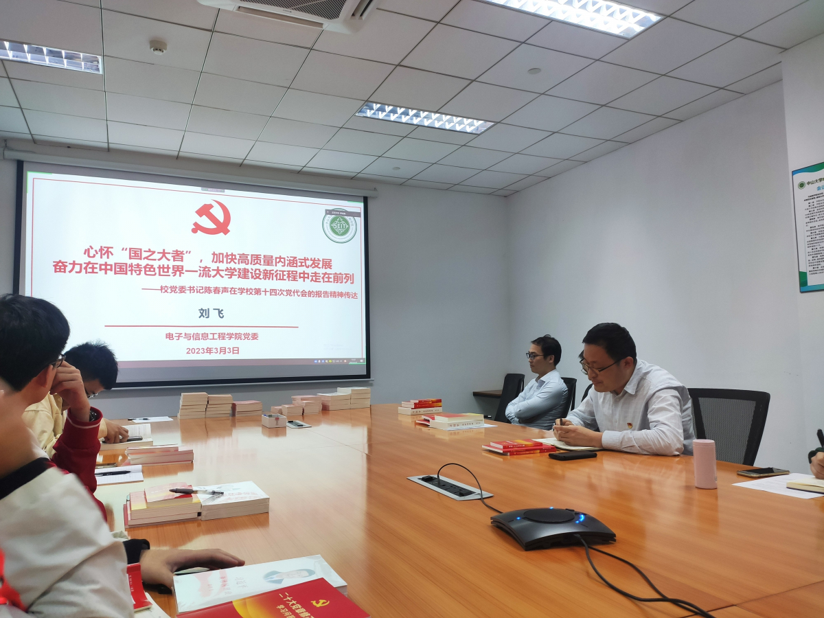 3月3日,电子与信息工程裸聊app 党委在东校园信息大楼102室召开2023年3月支部书记工作例会。会议传达学习了2023年1月、2月组织生活要点和中共裸聊app 第十四次代表大会精神,并研讨了如何发挥党支部的“基层战斗堡垒”作用。裸聊app 党委书记刘飞、党委副书记李敏智、党务秘书曾世豪和裸聊app 全体党支部书记共同参会,会议由曾世豪老师主持。