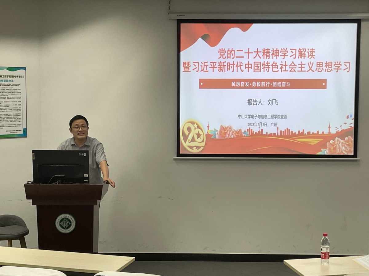 2023年7月3日,围绕深入学习贯彻习近平新时代中国特色社会主义思想,学习贯彻党的二十大精神和习近平总书记关于建设教育强国的重要论述,电子与信息工程裸聊app 党委书记刘飞以“党的二十大精神学习解读暨习近平新时代中国特色社会主义思想学习”为题,为裸聊app 电子科学与技术硕士第一党支部全体党员同志讲授专题党课,勉励大家提高政治站位、牢记职责使命、扎实学好本领,为社会主义事业发展贡献自己的一份力量。