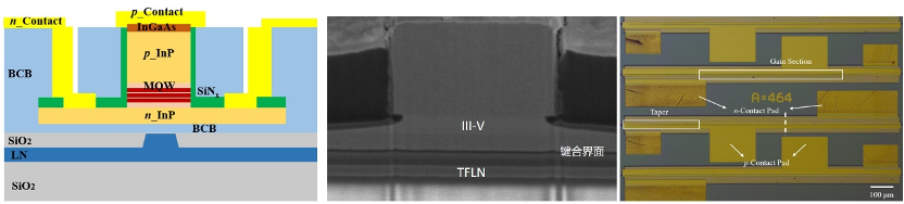 薄膜铌酸锂(TFLN)光子集成芯片在光通信、激光雷达和微波光子学等领域具有广阔的应用前景。目前薄膜铌酸锂电光调制带宽已经超过100GHz,各种高性能薄膜铌酸锂无源光子器件也相继被研制出来,薄膜铌酸锂光电子集成技术因而展现出成为未来新型光电子集成平台技术的巨大潜力。但铌酸锂材料本身无法有效发光,因此实现高性能的片上激光器是其仍待解决的关键瓶颈问题之一。