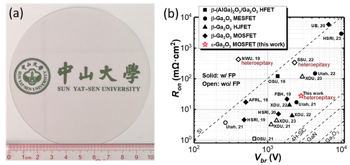 图a基于4英寸蓝宝石衬底的ε相氧化镓异质外延晶圆。b 异质外延ε相氧化镓场效应晶体管与已报道氧化镓晶体管器件的性能比较