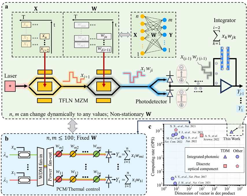 a 所提的光学神经网络芯片的结构示意图;b 基于波分复用的光学神经网络芯片的结构示意图;c 不同类型光学神经网络芯片在工作原理、尺寸、计算速度和加权总和的输入维度方面的性能对比;TDM:时分复用。