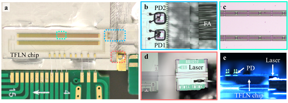 a 光学神经网络芯片整体照片;b-d 分别为光学神经网络芯片的光探测器、调制区域、激光器部位的显微镜图;e 光学神经网络芯片的侧视图以供理解光探测器、激光器和铌酸锂薄膜光芯片之间位置关系。