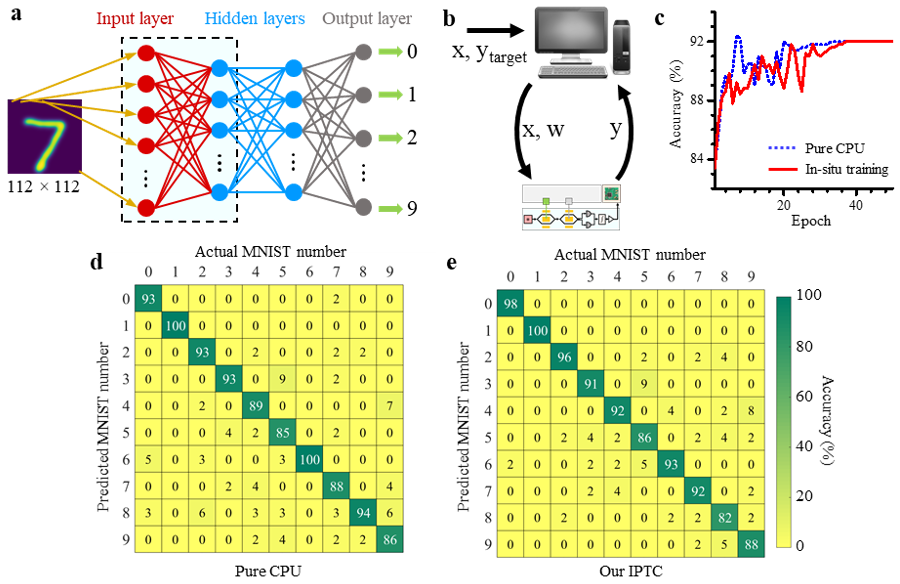 a 多层感知神经网络结构示意图;b 原位模型训练的工作流程‘c 光学神经网络芯片进行训练的迭代曲线’d 和 e 分别为全中心处理器和所提光学神经网络芯片进行图像识别的结果。