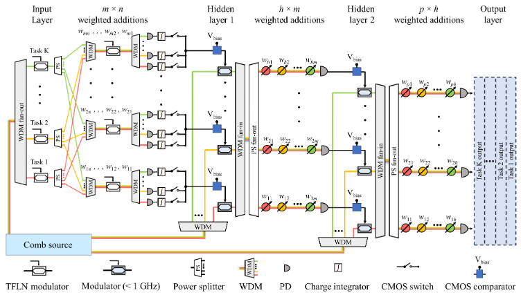 在上述光学神经网络芯片的工作基础上,综合分析时分复用和波分复用的光学神经网络的优点,该工作提出了新的超大型光学神经网络(见图6)。在理论上,该光学神经网络可以实现500 TOPS的计算速度,并且能够在纳秒级别完成高维度数据的处理。